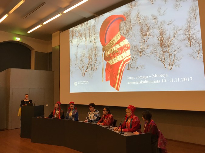 Duoji vuoigŋa – Muotoja saamelaiskulttuurista -dáhpáhus Suoma álbmotmuseas 11.11.2017. Govas (gur.) Eeva-Kristiina Harlin, Outi Pieski, Áile AIkio, Maarit Magga, Sigga-Marja Magga, Hanna Helander ja Piia Nuorgam. Photo: Pirita Näkkäläjärvi